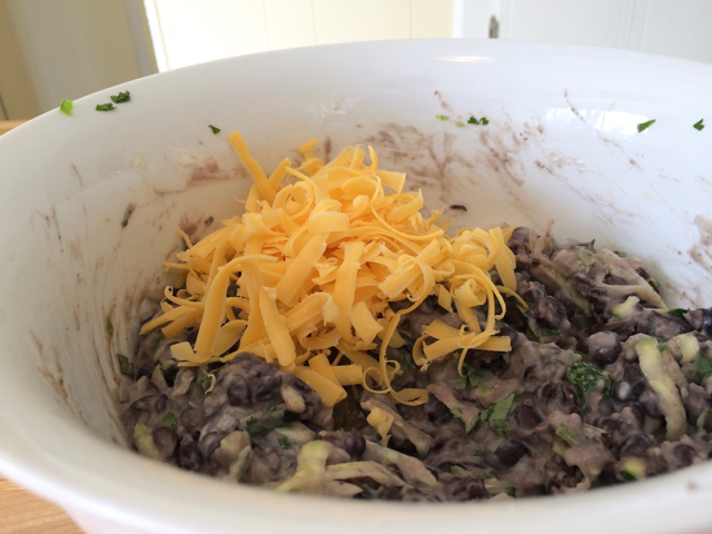 - Add the grated onion, zucchini, jalapeño pepper, garlic, and cilantro to the black bean mixture and mix in.