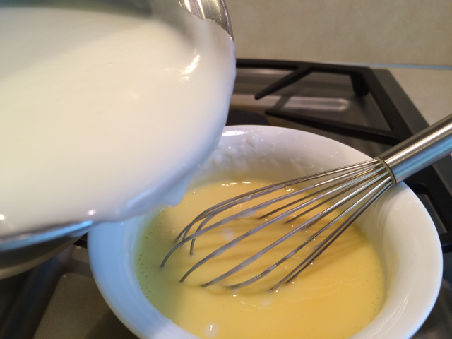 - Working fast and stirring vigorously with a whisk, gradually pour at least half of the hot mixture into the egg yolks. This method will ensure that the yolks do not cook in the hot liquid and form lumps in the filling.