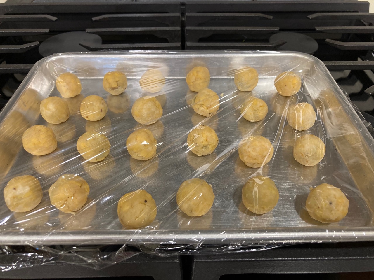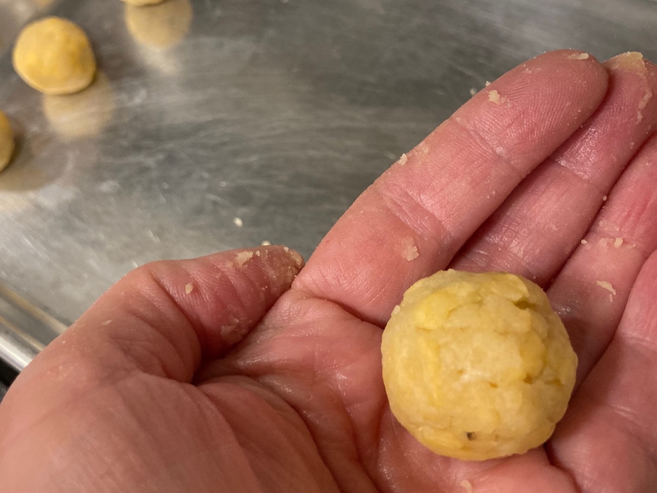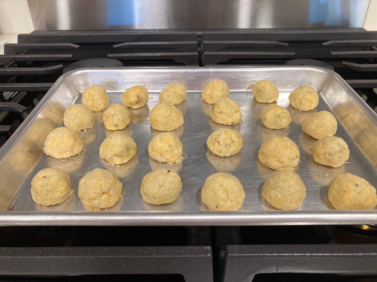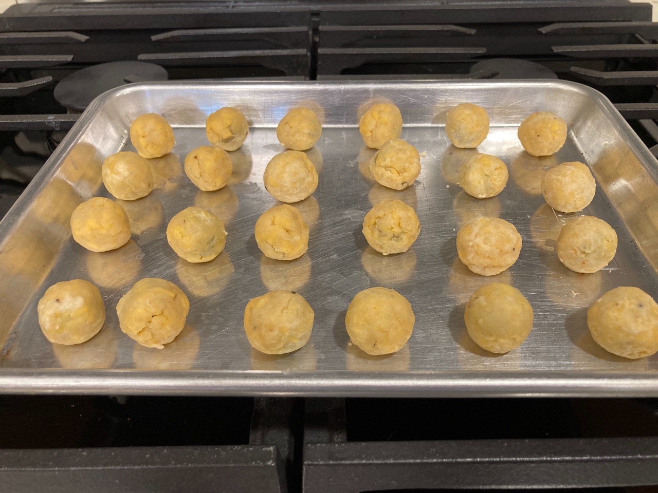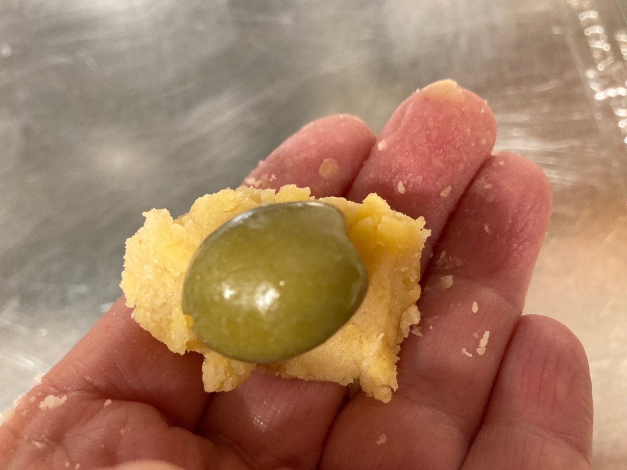 - Mold 1 teaspoon of dough around each olive and roll between your palms to shape into a ball. NOTE: An exact teaspoon of dough is just right. Too much dough will overwhelm the olives.
