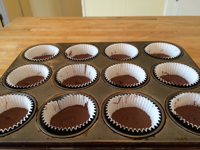 - Pick up the muffin tin with both hands and tap on flat surface to make sure all of the chocolate is flattened and smoothed in the liners.