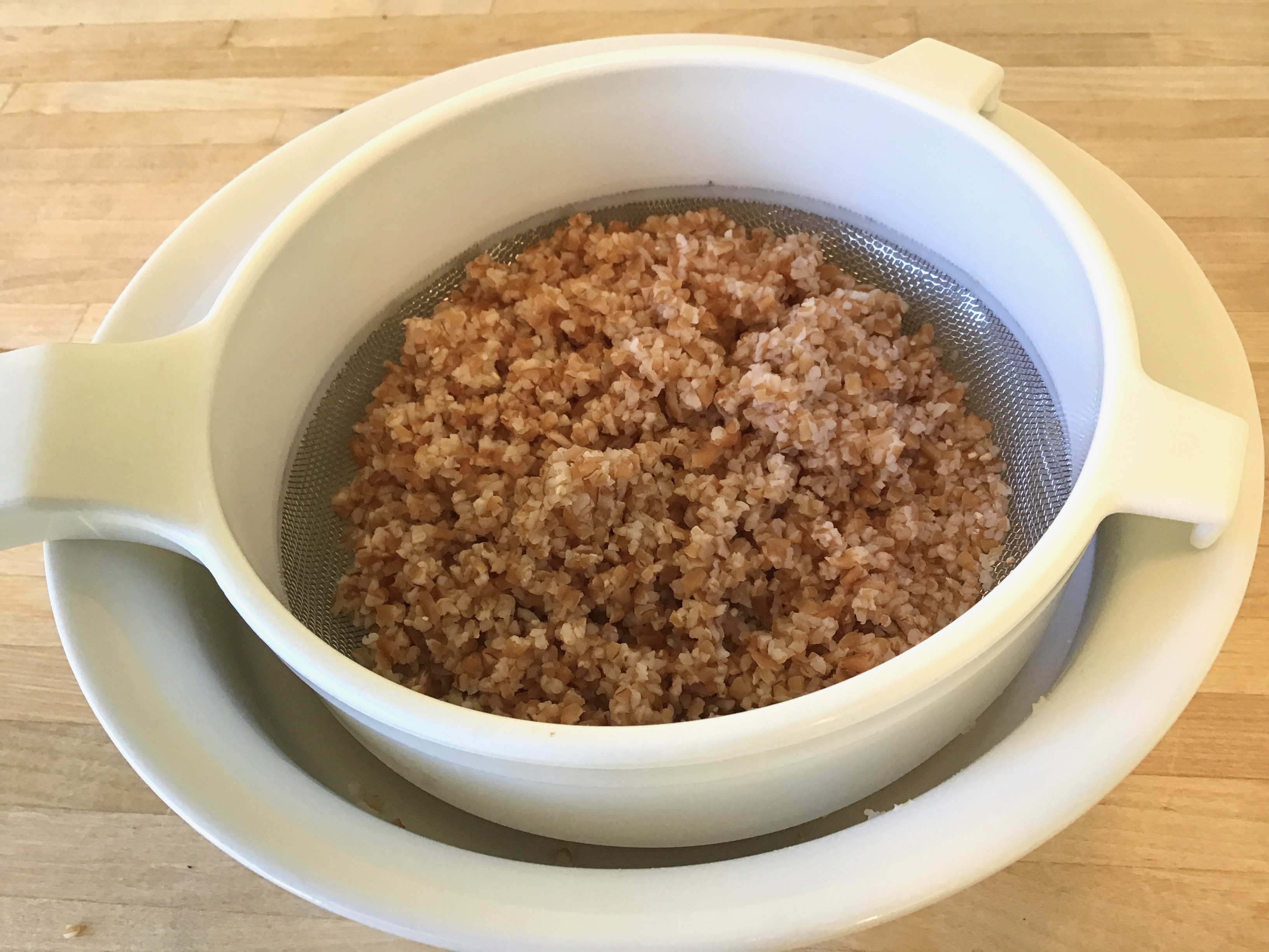 - Drain bulgur in a sieve, pressing with the back of large spoon to remove excess moisture.